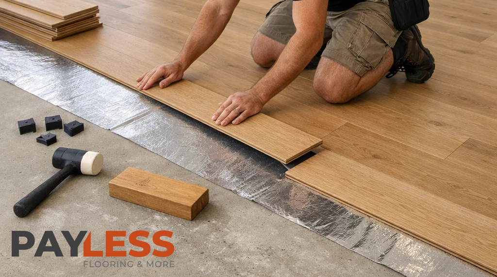 If required, an underlayment or moisture barrier is selected and applied, particularly on concrete surfaces, to increase the durability of the flooring and reduce sound transmission.