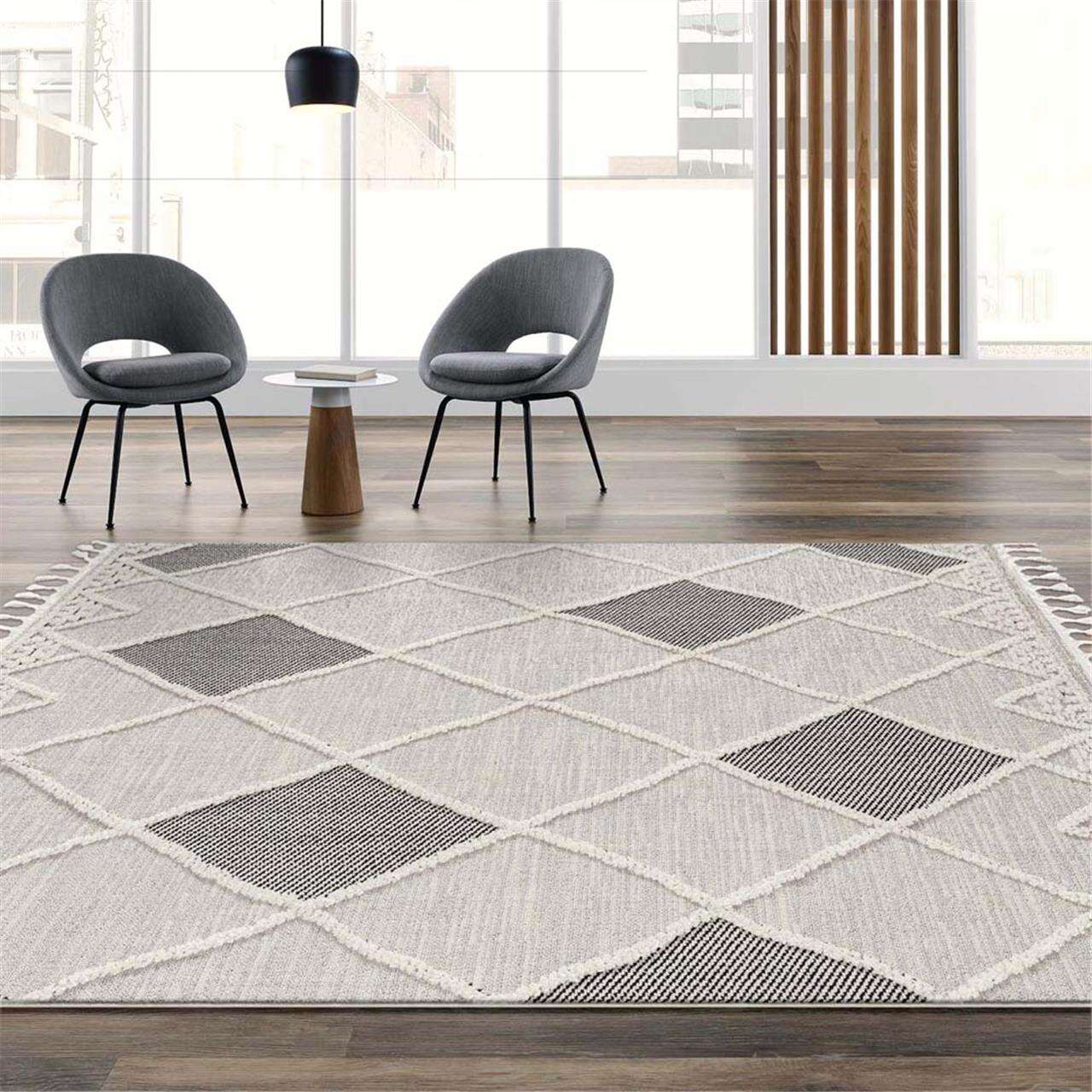 This attractive collection, with its subtle designs and geometric patterns is made from soft polyester, and has a high-and-low sculpted pile with up to 20 mm. thickness. The harmonious colour scheme used in this fashionable collection is complemented with versatile motifs and finished with braided fringes. This highly decorative collection is power loomed in Turkey and has shed-resistant, anti-static properties.