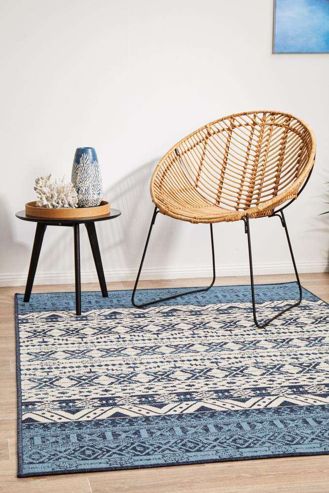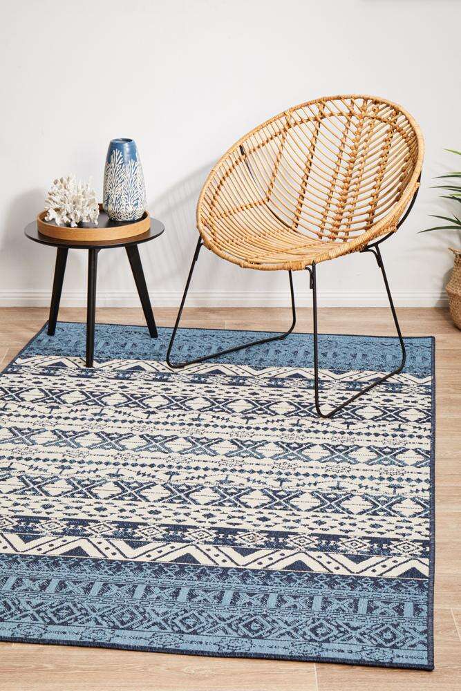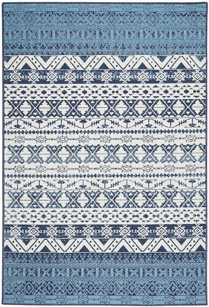 This tribal inspired motif in gorgeous blues bring a bit of boho to every space. This easy-care collection is designed to be used outdoors as well as indoors, these rugs are water resistant and will add an element of fun to any space. This short, easy to clean pile made from durable polypropylene and is power loomed.